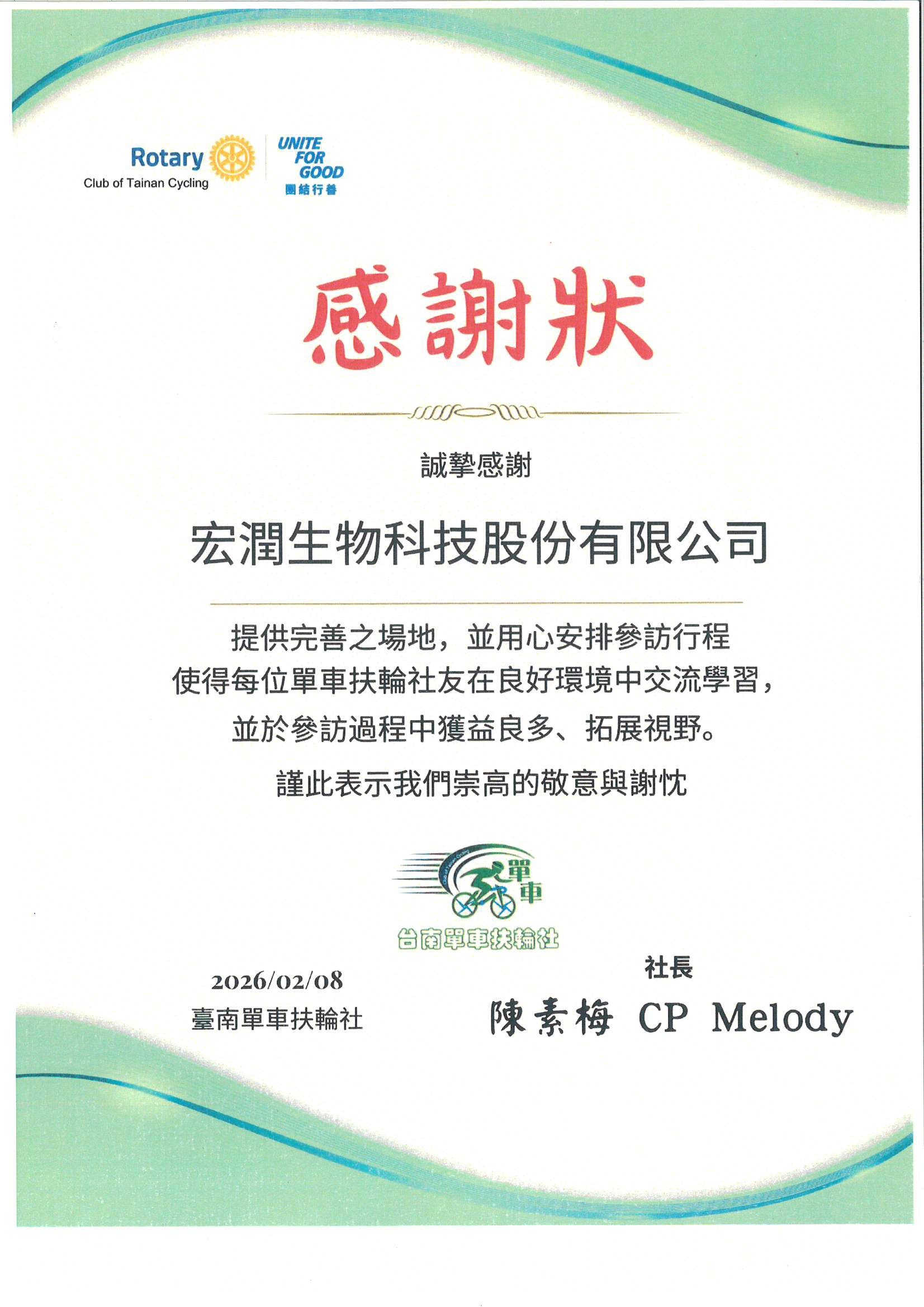 台南單車扶輪社於 2/8 蒞臨宏潤生技六甲廠參訪交流,深入了解產品與精準健康理念。